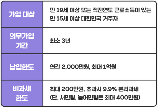 - 최소 3년 의무가입, 비과세 한도(200만 원~400만 원) 초과 시 9.9% 분리과세