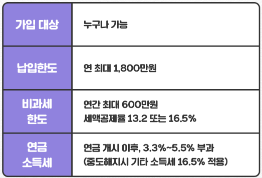 - 연 최대 1800만 원 납입 가능, 세액공제 한도는 최대 600만 원(공제율 13.2%~16.5%)