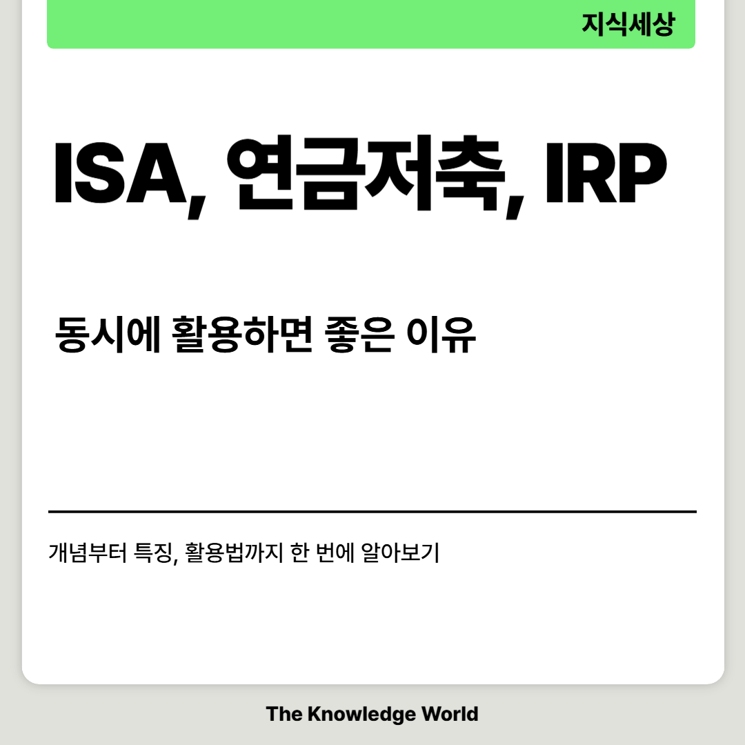 1. 들어가며재테크에 관심이 많은 분이라면 ISA, 연금저축, 그리고 IRP라는 단어를 자주 접해보셨을 겁니다. 이 중 하나만 가입하더라도 절세와 투자 면에서 이점을 누릴 수 있지만, 세 상품을 목적에 맞게 조합하면 훨씬 더 큰 효과를 낼 수 있습니다. 최근 금융권에서는 ISA를 통한 중기 투자, 연금저축과 IRP를 통한 노후 대비와 세액공제를 적극적으로 권장하고 있습니다. 하지만 막상 상품 정보를 찾아봐도 헷갈리는 부분이 많죠. 그래서 이번 글에서는 세 상품이 각각 어떤 특징을 가졌는지, 동시에 활용했을 때 시너지가 어떻게 발생하는지 자세히 살펴보겠습니다.2. ISA(개인종합자산관리계좌) : 금융상품 투자 + 절세 혜택먼저 ISA부터 알아볼까요?2-1. ISA란 무엇일까?ISA(개인종합자산관리계좌) :..